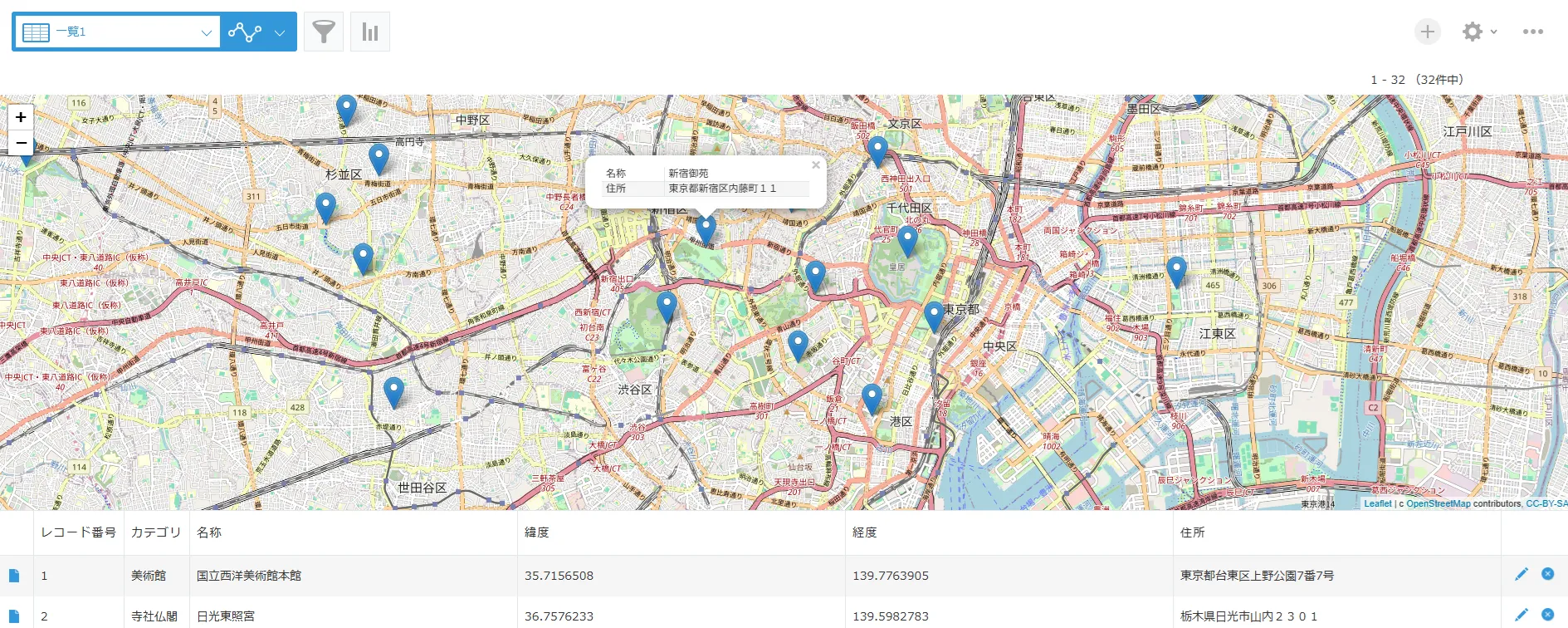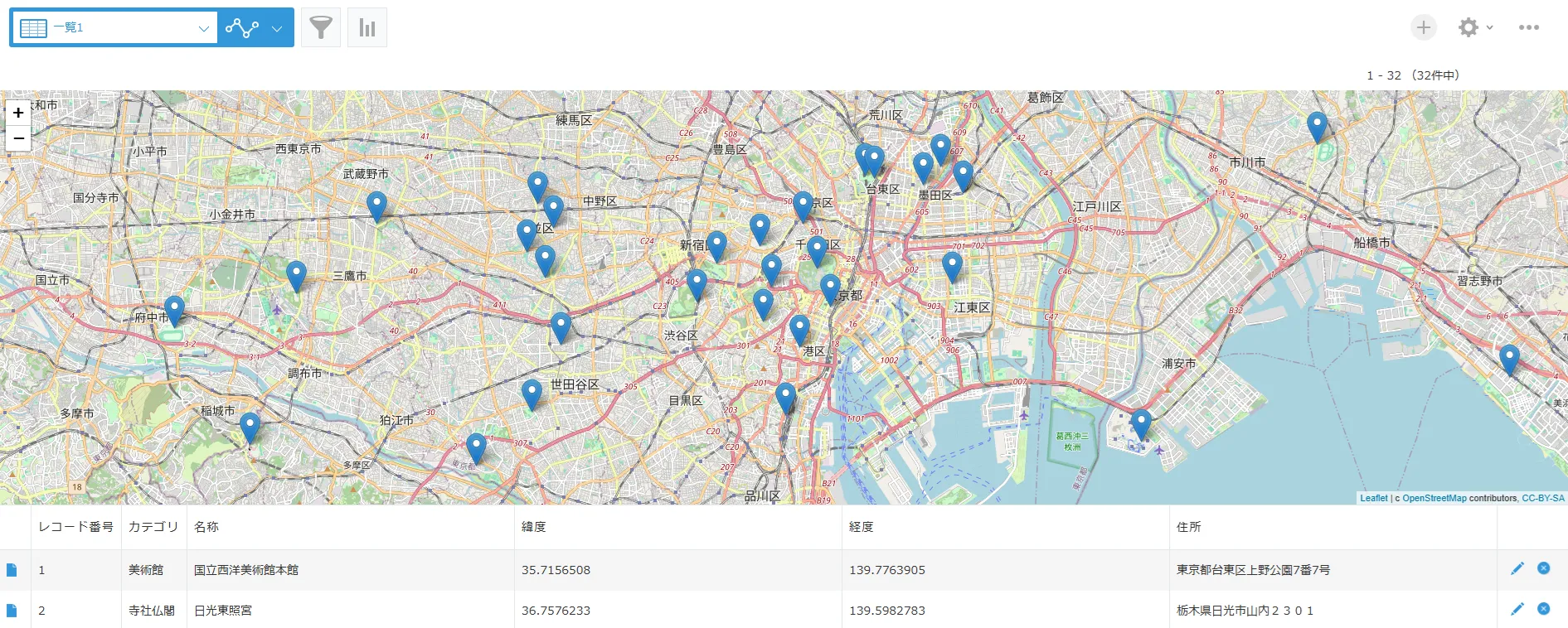 ピンの表示は一覧に表示されている(絞り込まれている)レコードが対象となります。