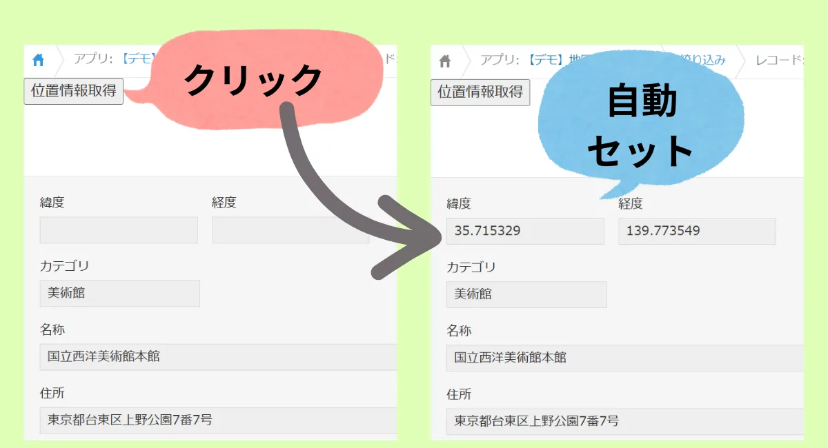 | 緯度・経度の自動取得 | 保存時に住所から自動取得可 | 詳細画面でボタンをクリックすることで取得可 |
