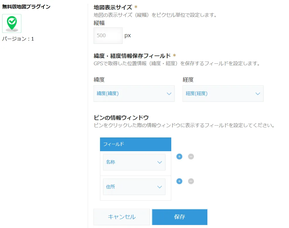 ピン表示の元データとなる緯度・経度を格納するフィールドを指定します。