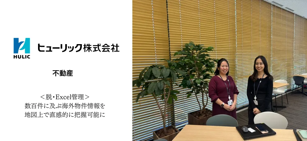 ヒューリック株式会社では、海外不動産の投資・開発を担う海外事業部において、数百件に及ぶ物件情報の管理効率化を目的にKマッププラグインを導入した。これまでExcelで管理していた物件情報をkintone上で地図と統合することで、地域ごとの投資状況や市場の傾向を視覚的に把握できる仕組みを構築。限られた人員でも精度の高い投資判断を実現するための業務改善を進めている。今回は、導入前に抱えていた課題や導入の決め手、得られた効果について、海外事業部の窪谷様、ヒューリックプロサーブ株式会社システム・事務部の吉田様にお話を伺った。