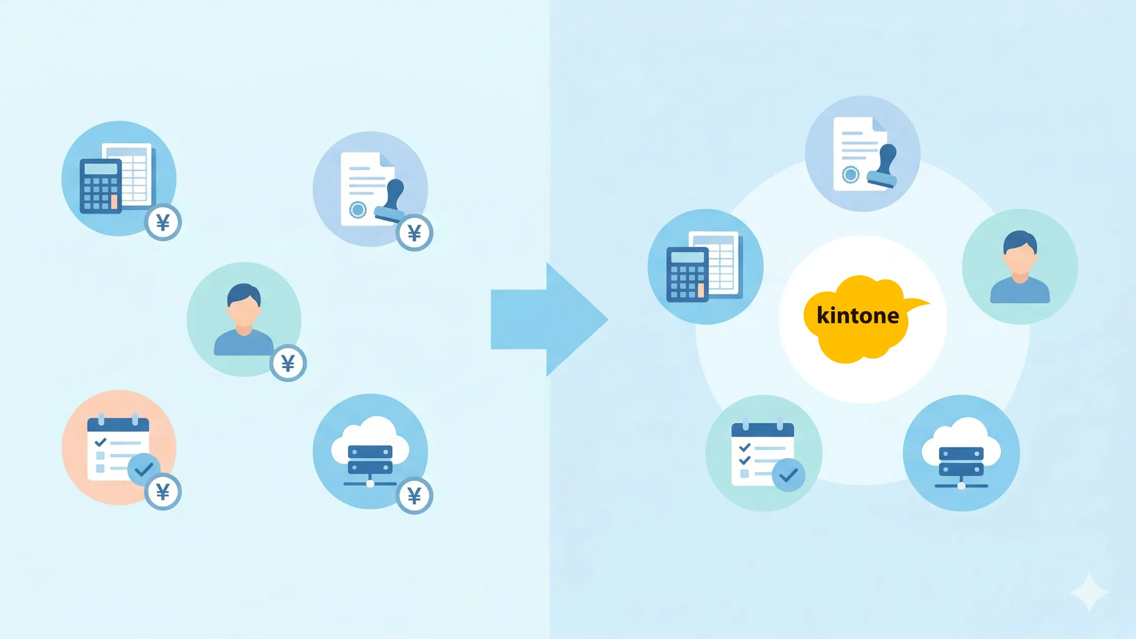 特化型サービスの集約: 経費精算、稟議/申請システム、採用・備品管理など、月額500円前後の特化型SaaSをkintoneアプリに置き換えることも有効です。既存コストを削減しつつ情報を一元化できるため、kintoneが担う投資対効果(ROI)を最大化できます。