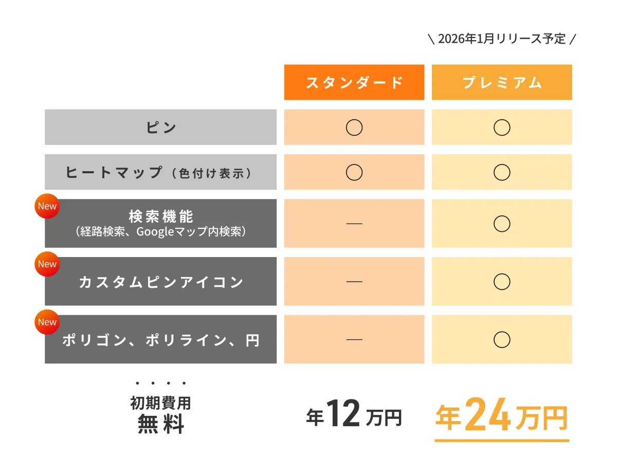 地図情報システムをリーズナブルに実現できます。初期費用も不要でセルフサービスで導入可能。